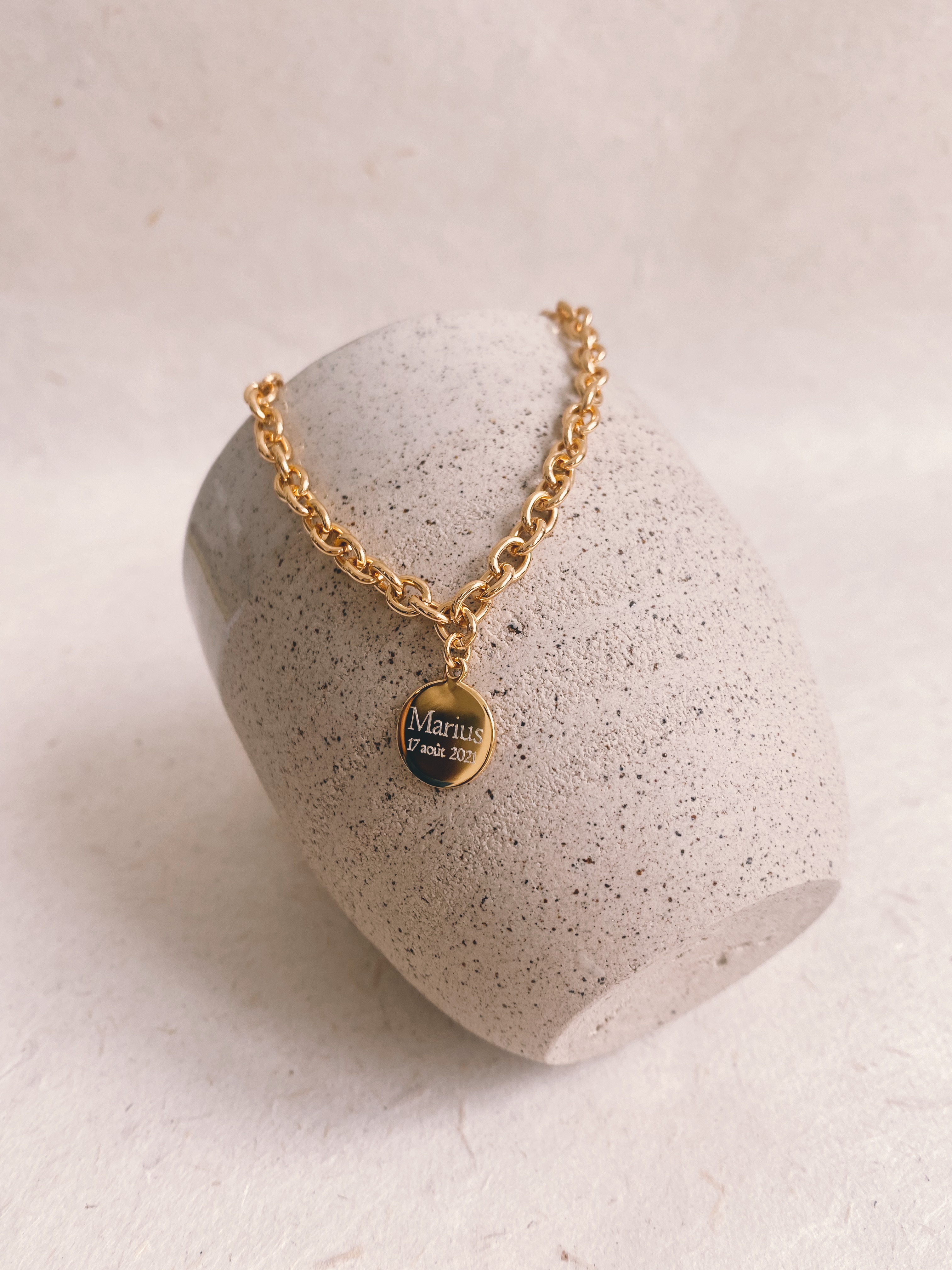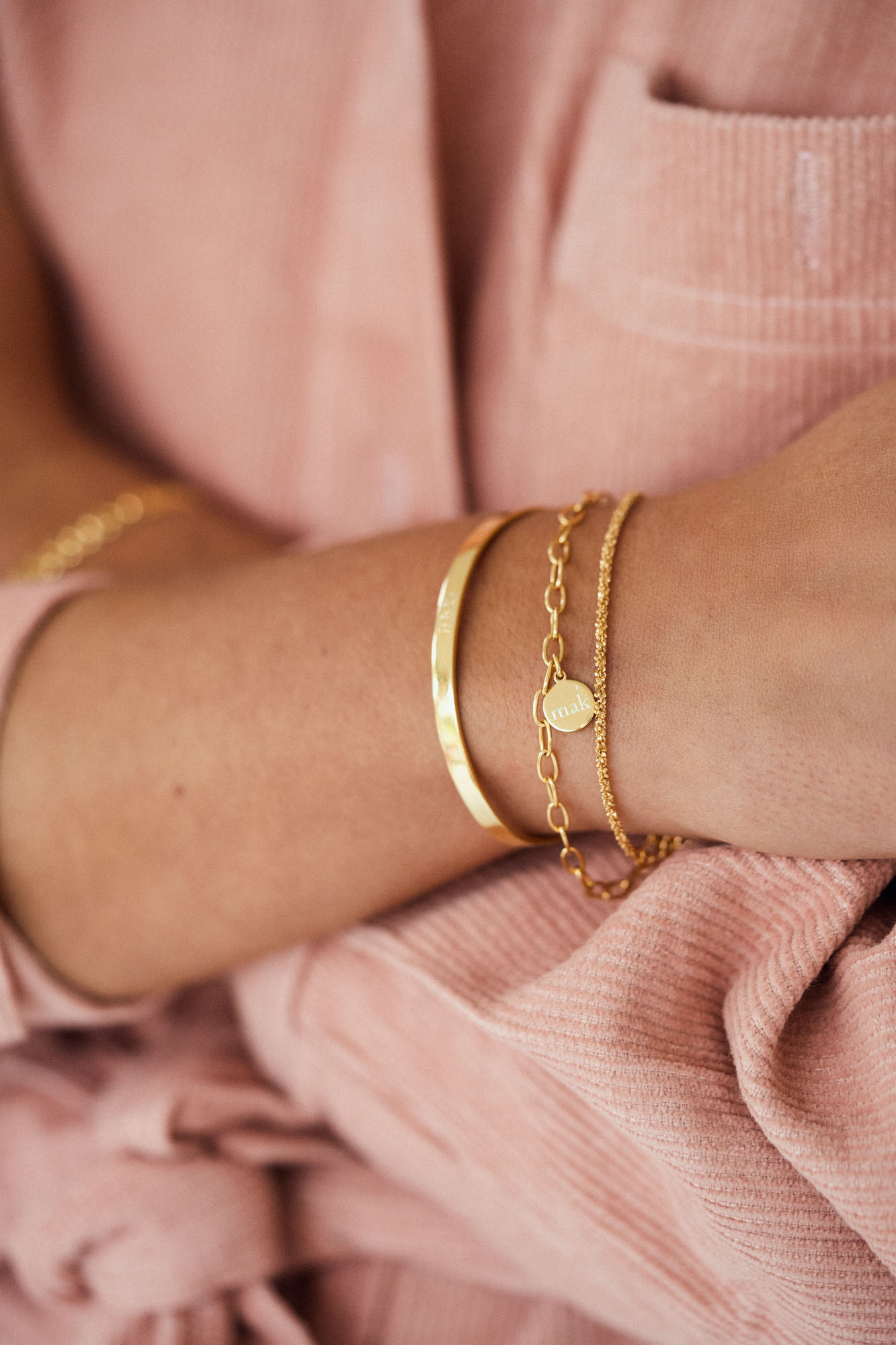 The Noma bracelet is part of our timeless collection. With its larger links and its engraving medallion, Noma can be worn alone or with other pieces like our Nayka or Gilda I bracelet. A must-have for your jewelry collection!